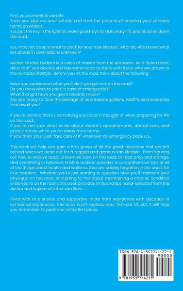 First, you commit to van life. Then, you pick out your vehicle and start the process of creating your ultimate home on wheels. You put the key in the ignition, wave good-bye to stationary life, and head on down the road. You may not be sure what to pack for your new lifestyle. After all, who knows what lies ahead in destinations unknown? Author Kristine Hudson is a voice of reason from the unknown. As a "been there, done that" van dweller, she has some notes to share with those who are drawn to the nomadic lifestyle. Before you hit the road, think about the following: ¿ Have you considered what you'll do if you get sick on the road? ¿ Do you know what to pack in case of emergencies? ¿ What thought have you given towards meals? ¿ Are you ready to face the barrage of new insects, pollens, wildlife, and scenarios that await you? If you're worried there's something you haven't thought of when preparing for life on the road... If you're not sure what to do about doctor's appointments, dental care, and prescriptions while you're away from home... If you think you'll just "take care of it" whenever an emergency pops up... This book will help you gain a firm grasp of all the good intentions that are left behind when we head out for a rugged and glorious van lifestyle. From figuring out how to receive basic preventive care on the road, to food prep and storage, and everything in between, Kristine Hudson provides a comprehensive look at all of the things about health and wellness that are quickly forgotten in the quest for true freedom. Whether you're just starting to question how you'll maintain your physique on the road, or starting to fret about maintaining a chronic condition while you're on the roam, this book provides hints and tips hand-selected from the author and legions of other van lifers. Filled with true stories and supportive tricks from wanderers with decades of combined experience, this book won't replace your first-aid kit...but it will help you remember to pack one in the first place.