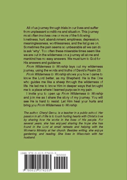 My book is about my personal journey to deeper intimacy with the Lord. I share the pain of my depression along with the hope I found in the Lord. Each chapter is themed by a portion of the 23rd Psalm. The wilderness times of life leave us searching for hope. My prayer is that as you follow with me on my journey, you will see how irresistible the Lord is. He is the one who truly heals. He brought me from wilderness to worship, He can do the same for you.