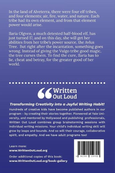In the land of Alveterra, there were four elf tribes, and four elements; air, fire, water, and nature. Each tribe had its own element, and from that element power would arise. Ilaria Olgven, a much detested half-blood elf, has just turned 17, and on this day, she will get her abilities from her tribe's power source, the Avlus Tree. But right after the incantation, something goes wrong. Instead of giving the Vulgo tribe good magic, the tree curses them. To find the cure, Ilaria has to lie, cheat and betray, for the greater good of her world.