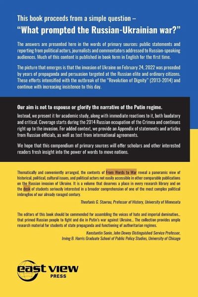 This book proceeds from a simple question - "What prompted the Russian-Ukrainian war?" The answers are presented here in the words of primary sources: public statements and reporting from political actors, journalists and commentators addressed to Russian-speaking audiences. Much of this content is published in book form in English for the first time. The picture that emerges is that the invasion of Ukraine on February 24, 2022 was preceded not just by preparatory actions of the Russian military - joint exercises in post-Soviet space and the buildup of troops at the Ukrainian border - but by years of propaganda and persuasion targeted at the Russian elite and ordinary citizens. These rhetorical efforts emerged particularly strongly with the outbreak of the "Revolution of Dignity" (2013-2014) and continue with increasing insistence to this day. Our aim is not to espouse or glorify the narrative of the Putin regime. Instead, we present it for academic study, along with immediate reactions to it, both laudatory and critical. Most of the articles, speeches, interviews and reports featured here originally appeared in East View's English-language periodical The Current Digest of the Russian Press. Coverage starts during the 2014 Russian occupation of the Crimea and continues right up to the invasion. We hope that this compendium of primary sources - many of them published in English for the first time - will offer scholars and other interested readers fresh insight into the power of words to move nations.