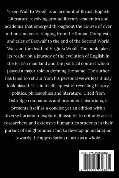 'From Wulf to Woolf' is an account of British English Literature revolving around literary academics and academia that emerged throughout the course of over a thousand years ranging from the Roman Conquests and tales of Beowulf to the end of the Second World War and the death of Virginia Woolf. The book takes its reader on a journey of the evolution of English in the British mainland and the political context which played a major role in defining the same. The author has tried to refrain from his personal views less it may look biased. It is in itself a quest of revealing history, politics, philosophies and literature. Cited from Oxbridge companions and prominent historians, it presents itself as a concise yet an edition with a diverse horizon to explore. It assures to not only assist researchers and extensive humanities students in their pursuit of enlightenment but to develop an inclination towards the appreciation of arts as a whole.