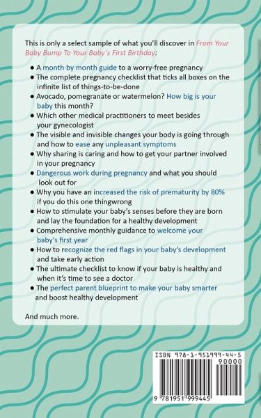 Why 80% of Expecting Parents Worry About The Wrong Things And What You Really Need to Know Am I going to be a good mom Is my child going to be healthy? I don't feel any kicks after going to the gym. Did I hurt my baby? It doesn't matter where you are or what you do, your thoughts constantly turn around this little wonder inside your bump. As beautiful as pregnancy can be, it's also a scary transition period in life where big mental and physical changes start to happen. Unfortunately, many women don't dare to talk about the stress they are experiencing. They let the feeling of insecurity creep up on them and ruin one of the most special experiences in a women's life. Yet, it's not uncommon to feel this way. Nearly 75% of women reported they had experienced at least one stressful event during their pregnancy. These women have an up to 60% higher risk of preterm delivery. And then, there is the big day. You'll finally meet your baby, but again you are confronted with a million questions such as: Who can be with me during labor? When do I need to push? What if my baby is in the wrong position? And the list keeps going. You hoped your worries would ebb away once your little one is born, but your struggles continue. A study by the National Sleep Foundation found that 76% of parents have frequent sleep problems. No wonder. Your head is full of worries and open questions about your baby's health and development. Beating all this stress is easier than you think. All you need is some expert knowledge and the right guidance to enjoy your pregnancy and your baby's first year to the fullest. This is only a select sample of what you'll discover in From Your Baby Bump To Your Baby¿s First Birthday: A month by month guide to a worry-free pregnancy The complete pregnancy checklist that ticks all boxes on the infinite list of things-to-be-done Avocado, pomegranate or watermelon? How big is your baby this month? Which other medical practitioners to meet besides your gynecologist The visible and invisible changes your body is going through and how to ease any unpleasant symptoms Why sharing is caring and how to get your partner involved in your pregnancy Dangerous work during pregnancy and what you should look out for Why you have an increased the risk of prematurity by 80% if you do this one thing wrong How to stimulate your baby's senses before they are born and lay the foundation for a healthy development Comprehensive monthly guidance to welcome your baby's first year How to recognize the red flags in your baby's development and take early action The ultimate checklist to know if your baby is healthy and when it's time to see a doctor The perfect parent blueprint to make your baby smarter and boost healthy development And much more. Even if you are having a baby on a budget, you shouldn't save money on the wrong things. Missing out on professional knowledge can harm your baby forever and lead to major health and development issues. If you want to be responsible for you and your baby's health and wellbeing, then scroll up and click "Add to Cart" right now.
