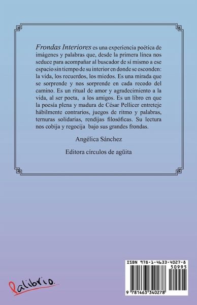 Frondas Interiores es una experiencia poética de imágenes y palabras que, desde la primera línea nos seduce para acompañar al buscador de sí mismo a ese espacio sin tiempo de su interior en donde se esconden: la vida, los recuerdos, los miedos. Es una mirada que se sorprende y nos sorprende en cada recodo del camino. Es un ritual de amor y agradecimiento a la vida, al ser poeta, a los amigos. Es un libro en que la poesía plena y madura de César Pellicer entreteje hábilmente contrarios, juegos de ritmo y palabras, ternuras solidarias, rendijas filosóficas. Su lectura nos cobija y regocija bajo sus grandes frondas. Angélica Sánchez Editora círculos de agüita