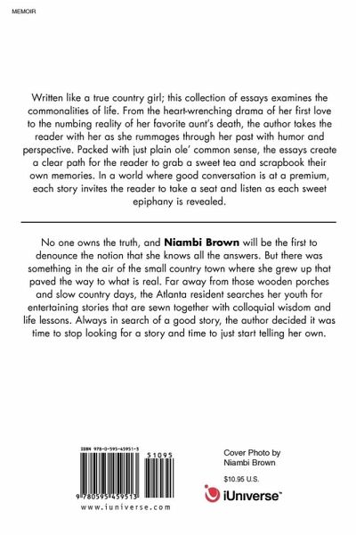 Written like a true country girl; this collection of essays examines the commonalities of life. From the heart-wrenching drama of her first love to the numbing reality of her favorite aunt's death, the author takes the reader with her as she rummages through her past with humor and perspective. Packed with just plain ole' common sense, the essays create a clear path for the reader to grab a sweet tea and scrapbook their own memories. In a world where good conversation is at a premium, each story invites the reader to take a seat and listen as each sweet epiphany is revealed.