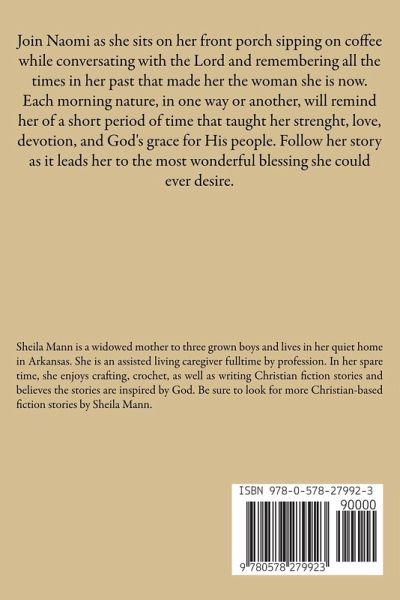 Join Naomi as she sits on her front porch sipping on coffee while conversating with the Lord and remembering all the times in her past that made her the woman she is now. Each morning nature will remind her of a short period of time that taught her strenght, love, devotion, and God's grace for His people. Follow her story as it leads her to the most wonderful blessing she could ever desire.