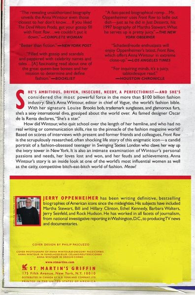 She's ambitious, driven, insecure, needy, a perfectionist-and she's considered the most powerful force in the more than $100 billion fashion industry. She's Anna Wintour, editor in chief of Vogue, the world's fashion bible. With her signature Louise Brooks bob, trademark sunglasses, and glamorous furs, she's a sexy international diva, gossiped about the world over. As famed designed Oscar de la Renta declares, "She's a star." How did Wintour, who quit school over the length of her hemline, and who had no real writing or communication skills, rise to the pinnacle of the fashion magazine world? Based on scores of interviews with present and former friends and colleagues, Front Row is the scrupulously researched, often shocking life story of this enigmatic icon-a candid portrait of a fashion-obsessed teenager in Swinging Sixties London who claws her way up the ivory tower in New York. It is also an intimate examination of Wintour's personal passions and needs, her loves lost and won, and her feuds and achievements. Anna Wintour's story is an inside look at one of the world's most influential women as well as the catty, competitive bitch-eat-bitch world of fashion. Meow!
