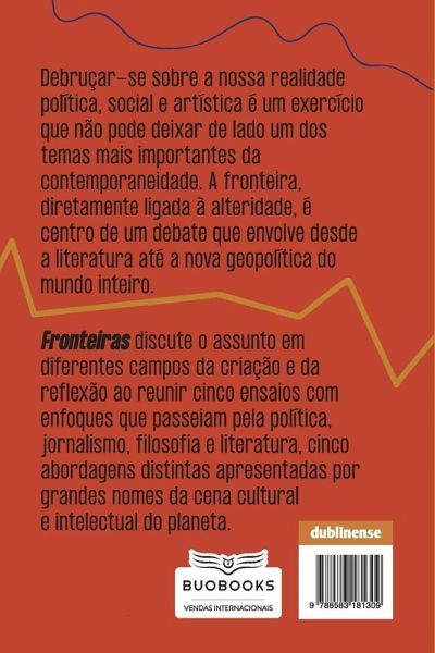 Debruçar-se sobre a nossa realidade política, social e artística é um exercício que não pode deixar de lado um dos temas mais importantes da contemporaneidade. A fronteira, diretamente ligada à alteridade, é centro de um debate que envolve desde a literatura até a nova geopolítica do mundo inteiro. Fronteiras discute o assunto em diferentes campos da criação e da reflexão ao reunir cinco ensaios com enfoques que passeiam pela política, jornalismo, filosofia e literatura, cinco abordagens distintas apresentadas por grandes nomes da cena cultural e intelectual do planeta.