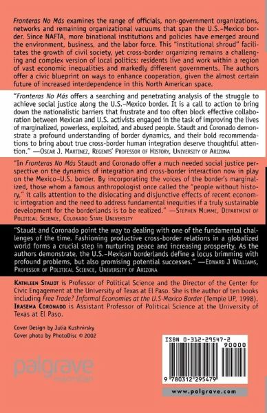 Fronteras No Mas examines the range of officials, non-government organizations, networks and remaining organizational vacuums that span the U.S. - Mexico border. Since NAFTA, more binational institutions and policies have emerged around the environment, business, and the labor force. This 'institutional shroud' facilitates the growth of civil society, yet cross-border organizing remains a challenging and complex version of local politics. Residents live and work within a region of vast economic inequalities and markedly different governments. The authors offer a civic blueprint on ways to enhance cooperation, given the almost certain future of increased interdependence in this North American space.