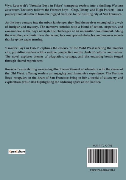 Wyn Roosevelt's "Frontier Boys in Frisco" transports readers into a thrilling Western adventure. The story follows the Frontier Boys¿Chip, Jimmy, and High-Pockets¿on a journey that takes them from the rugged frontiers to the bustling city of San Francisco. As the boys venture into the urban landscape, they find themselves entangled in a web of intrigue and mystery. The narrative unfolds with a blend of action, suspense, and camaraderie as the boys navigate the challenges of an unfamiliar environment. Along the way, they encounter new characters, face unexpected obstacles, and uncover secrets that keep the pages turning. "Frontier Boys in Frisco" captures the essence of the Wild West meeting the modern city, providing readers with a unique perspective on the clash of cultures and values. The novel explores themes of adaptation, courage, and the enduring bonds forged through shared experiences. Roosevelt's storytelling weaves together the excitement of adventure with the charm of the Old West, offering readers an engaging and immersive experience. The Frontier Boys' escapades in the heart of San Francisco bring to life a world of discovery and exploration, while also highlighting the enduring spirit of the frontier.