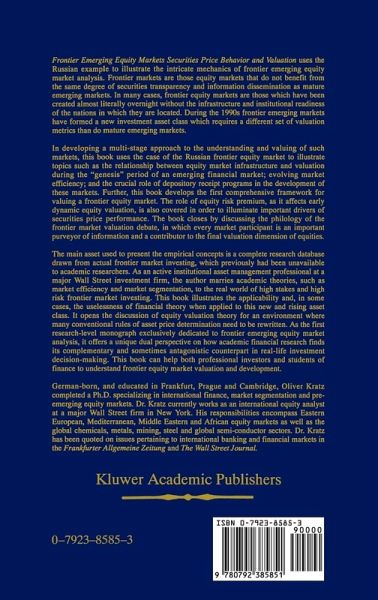 Market Efficiency in Frontier Emerging Markets.- Frontier Emerging Equity Market Infrastructure.- Data and Descriptive Features of a Frontier Equity Market.- Information Channels in Frontier Emerging Markets.- Econometrics of Measuring Frontier Equity Market Efficiency.- Running the Numbers on a Frontier Market.- ADRs and GDRs - International Depository Receipts in Frontier Markets.- Valuation Approaches to Frontier Equity Markets.- The Philology of Frontier Equity Markets.