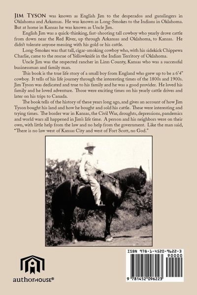 Jim Tyson was known as English Jim to the desperados and gunslingers in Oklahoma and Arkansas. He was known as Long-Smokes to the Indians in Oklahoma. But at home in Kansas he was known as Uncle Jim. English Jim was a quick-thinking, fast-shooting tall cowboy who yearly drove cattle from down near the Red River, up through Arkansas and Oklahoma, to Kansas. He didn't tolerate anyone messing with his gold or his cattle. Long-Smokes was that tall, cigar-smoking cowboy who, with his sidekick Chippewa Charlie, came to the rescue of Yellowknife in the Indian Territory of Oklahoma. Uncle Jim was the respected rancher in Linn County, Kansas who was a successful businessman and family man. This book is the true life story of a small boy from England who grew up to be a 6'4" cowboy. It tells of his life journey through the interesting times of the 1800s and 1900s. Jim Tyson was dedicated and true to his family and he was a good provider. He loved his family and he was a good provider. He loved his family and he loved adventure. Those were exciting times on his yearly cattle drives and later on his trips to Canada. The book tells of the history of these years long ago, and gives an account of how Jim Tyson bought his land and how he bought and sold his cattle. These were interesting and trying times. The border war in Kansas, the Civil War, droughts, depressions, pandemics and world wars all happened in Jim's life time. A person and his neighbors were on their own, with little help from the law and no help from the government. Like the man said, "There is no law west of Kansas City and west of Fort Scott, no God."