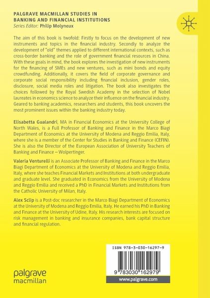 The aim of this book is twofold: Firstly to focus on the development of new instruments and topics in the financial industry. Secondly to analyze the development of "old" themes applied to different international contexts, such as cross-border banking and the role of government financial resources in China. With these goals in mind, the book explores the investigation of new instruments for the financing of SMEs and new ventures, such as mini bonds and equity crowdfunding. Additionally, it covers the field of corporate governance and corporate social responsibility including financial inclusion, gender roles, disclosure, social media roles and litigation. The book also investigates the choices followed by the Royal Swedish Academy in the selection of Nobel laureates in economics science to analyze their influence on the financial industry. Geared to banking academics, researchers and students, this book uncovers the most prominent issues within the banking industry today.