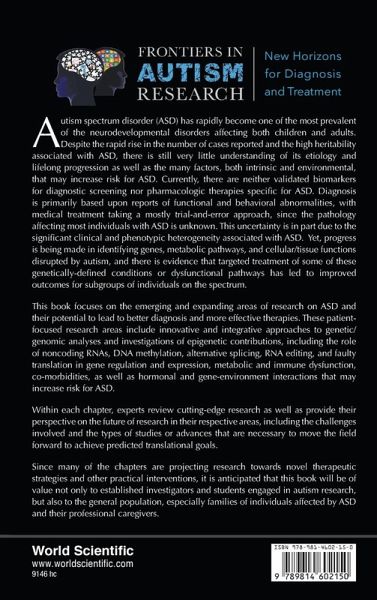 This book focuses on the emerging and expanding areas of research on ASD and their potential to lead to better diagnosis and more effective therapies. These areas include innovative and integrative approaches to genetic/genomic analyses and investigations of epigenetic contributions, including the role of noncoding RNAs, DNA methylation, alternative splicing, RNA editing, and faulty translation in gene regulation and expression, metabolic and immune dysfunction, co-morbidities, as well as hormonal and gene-environment interactions that may increase risk for ASD. Within each chapter, experts review cutting-edge research as well as provide their perspective on the future of research in their respective areas, including the challenges involved and the types of studies or advances that are necessary to move the field forward to achieve predicted translational goals.