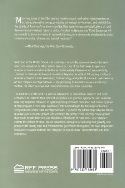 Most land in the United States is in rural areas, as are the sources of most of its fresh water and almost all its other natural resources. One of the first books to approach resource economics and rural studies as fundamentally interconnected areas of study, Frontiers in Resource and Rural Economics integrates the work of 18 leading scholars in resource economics, rural economics, rural sociology and political science in order to focus on two complex interdependencies-one pertaining to natural resources and human welfare, the other to urban and rural communities and their economies. The book reviews the past 50 years of scholarship in both natural resource and rural economics. It contrasts their different intellectual and practical approaches and considers how they might be refocused in light of pressing demands on human and natural systems. It then proposes a 'new rural economics' that acknowledges the full range of human-ecosystem and urban-rural interdependencies. It explores the relationship between natural resources and economic growth, and considers the prospects for amenity-driven growth that would benefit both new and traditional inhabitants of rural areas. Later chapters explore the politics of place, spatial economics, strategies for reducing rural poverty, and prospects for linking rural and environmental governance. Throughout, the book emphasizes innovative research methods that integrate natural resource, environmental, and rural economics.