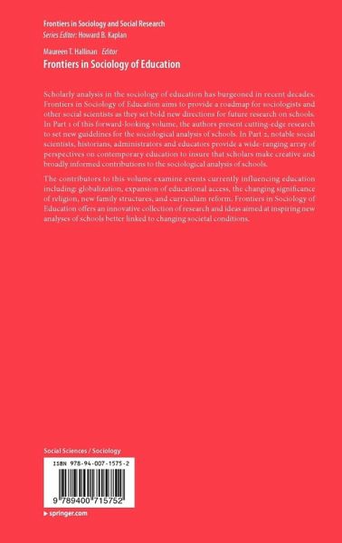 Scholarly analysis in the sociology of education has burgeoned in recent decades. Frontiers in Sociology of Education aims to provide a roadmap for sociologists and other social scientists as they set bold new directions for future research on schools. In Part 1 of this forward-looking volume, the authors present cutting-edge research to set new guidelines for the sociological analysis of schools. In Part 2, notable social scientists, historians, administrators and educators provide a wide-ranging array of perspectives on contemporary education to insure that scholars make creative and broadly informed contributions to the sociological analysis of schools.