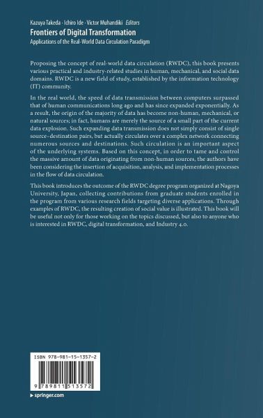 Chapter 1: Introduction to the Real-World Data Circulation Paradigm.- Chapter 2: A study on environmental sound modeling based on deep learning.- Chapter 3: A study on utilization of prior knowledge in underdetermined source separation and its application.- Chapter 4: A study on recognition of students' multiple mental states during discussion using multimodal data.- Chapter 5: Towards practically applicable quantitative information flow analysis.- Chapter 6: Research on high-performance high-precision elliptical vibration cutting.- Chapter 7: A study on efficient light field coding.- Chapter 8: Point cloud compression for 3D LiDAR sensor.- Chapter 9: Integrated planner for autonomous driving in urban environments including driving intention estimation.- Chapter 10: Direct numerical simulation on turbulent/non-turbulent interface in compressible turbulent boundary layers.- Chapter 11: Efficient text autocompletion for online services.- Chapter 12: Coordination analysis and term correction for statutory sentences using machine learning.- Chapter 13: Research of ICT utilization for consideration of town scape.- Chapter 14: Measuring efficiency and productivity of Japanese manufacturing industry considering spatial interdependence of production activities.