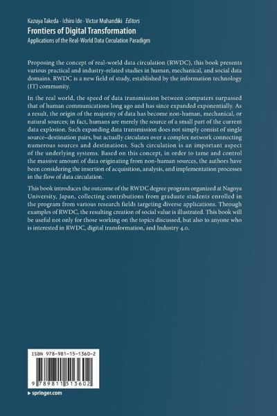 Chapter 1: Introduction to the Real-World Data Circulation Paradigm.- Chapter 2: A study on environmental sound modeling based on deep learning.- Chapter 3: A study on utilization of prior knowledge in underdetermined source separation and its application.- Chapter 4: A study on recognition of students' multiple mental states during discussion using multimodal data.- Chapter 5: Towards practically applicable quantitative information flow analysis.- Chapter 6: Research on high-performance high-precision elliptical vibration cutting.- Chapter 7: A study on efficient light field coding.- Chapter 8: Point cloud compression for 3D LiDAR sensor.- Chapter 9: Integrated planner for autonomous driving in urban environments including driving intention estimation.- Chapter 10: Direct numerical simulation on turbulent/non-turbulent interface in compressible turbulent boundary layers.- Chapter 11: Efficient text autocompletion for online services.- Chapter 12: Coordination analysis and term correction for statutory sentences using machine learning.- Chapter 13: Research of ICT utilization for consideration of town scape.- Chapter 14: Measuring efficiency and productivity of Japanese manufacturing industry considering spatial interdependence of production activities.