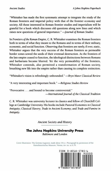 Whittaker argues that the very success of the Roman frontiers as permeable border zones sowed the seeds of their eventual destruction Although the Roman empire was one of the longest lasting in history, it was never ideologically conceived by its rulers or inhabitants as a territory within fixed limits. Yet Roman armies clearly reached certain points--which today we call frontiers--where they simply stopped advancing and annexing new territories. In Frontiers of the Roman Empire, C. R. Whittaker examines the Roman frontiers both in terms of what they meant to the Romans and in their military, economic, and social function. Observing that frontiers are rarely, if ever, static, Whittaker argues that the very success of the Roman frontiers as permeable border zones sowed the seeds of their eventual destruction. As the frontiers of the late empire ceased to function, the ideological distinctions between Romans and barbarians became blurred. Yet the very permeability of the frontiers, Whittaker contends, also permitted a transformation of Roman society, breathing new life into the empire rather than causing its complete extinction.