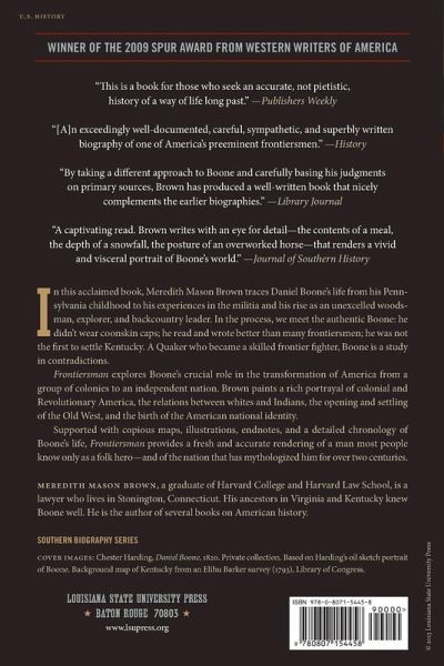 The name Daniel Boone conjures up the image of an illiterate, coonskin cap-wearing patriot who settled Kentucky and killed countless Indians. The scarcity of surviving autobiographical material has allowed tellers of his story to fashion a Boone of their own liking, and his myth has evolved in countless stories, biographies, novels, poems, and paintings. In this welcome book, Meredith Mason Brown separates the real Daniel Boone from the many fables that surround him, revealing a man far more complex -- and far more interesting -- than his legend. Brown traces Boone's life from his Pennsylvania childhood to his experiences in the militia and his rise as an unexcelled woodsman, explorer, and backcountry leader. In the process, we meet the authentic Boone: he didn't wear coonskin caps; he read and wrote better than many frontiersmen; he was not the first to settle Kentucky; he took no pleasure in killing Indians. At once a loner and a leader, a Quaker who became a skilled frontier fighter, Boone is a study in contradictions. Devoted to his wife and children, he nevertheless embarked on long hunts that could keep him from home for two years or more. A captain in colonial Virginia's militia, Boone later fought against the British and their Indian allies in the Revolutionary War before he moved to Missouri when it was still Spanish territory and became a Spanish civil servant. Boone did indeed kill Indians during the bloody fighting for Kentucky, but he also respected Indians, became the adopted son of a Shawnee chief, and formed lasting friendships with many Shawnees who once held him captive. During Boone's lifetime (1734--1820), America evolved from a group of colonies with fewer than a million inhabitants clustered along the Atlantic Coast to an independent nation of close to ten million reaching well beyond the Mississippi River. Frontiersman is the first biography to explore Boone's crucial role in that transformation. Hundreds of thousands of settlers entered Kentucky on the road that Boone and his axemen blazed from the Cumberland Gap to the Kentucky River. Boone's leadership in the defense of Boonesborough during a sustained Indian attack in 1778 was instrumental in preventing white settlers from fleeing Kentucky during the bloody years of the Revolution. And Boone's move to Missouri in 1799 and his exploration up the Missouri River helped encourage a flood of settlers into that region. Through his colorful chronicle of Boone's experiences, Brown paints a rich portrayal of colonial and Revolutionary America, the relations between whites and Indians, the opening and settling of the Old West, and the birth of the American national identity. Supported with copious maps, illustrations, endnotes, and a detailed chronology of Boone's life, Frontiersman provides a fresh and accurate rendering of a man most people know only as a folk hero -- and of the nation that has mythologized him for over two centuries.