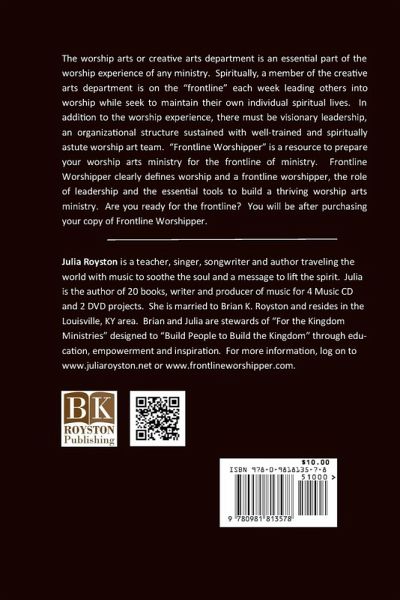 The worship arts or creative arts department is an essential part of the worship experience of any ministry. Spiritually, a member of the creative arts department is on the "frontline" each week leading others into worship while seek to maintain their own individual spiritual lives. In addition to the worship experience, there must be visionary leadership, an organizational structure sustained with well-trained and spiritually astute worship art team. "Frontline Worshipper" is a resource to prepare your worship arts ministry for the frontline of ministry. Frontline Worshipper clearly defines worship and a frontline worshipper, the role of leadership and the essential tools to build a thriving worship arts ministry. Are you ready for the frontline? You will be after purchasing your copy of Frontline Worshipper.