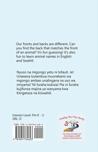 This beautifully photographed concept book teaches matching skills and Swahili through delight photos of animals. Our fronts and backs are different. Can you find the back that matches the front of an animal? It's fun guessing! It's also fun to learn animal names in English and Swahili. Grade Interest:Pre-K-3 GRL:D