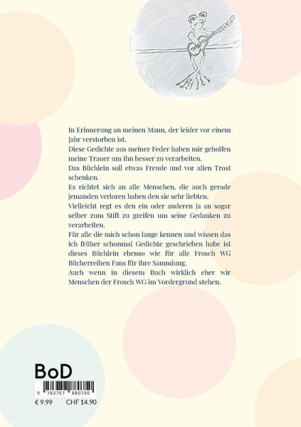 In Erinnerung an meinen Mann, der leider vor einem Jahr verstorben ist.Diese Gedichte aus meiner Feder haben mir geholfen meine Trauer um ihn besser zu verarbeiten.Das Büchlein soll etwas Freude und vor allen Trost schenken.Es richtet sich an alle Menschen, die auch gerade jemanden verloren haben den sie sehr liebten.Vielleicht regt es den ein oder anderen ja an sogar selber zum Stift zu greifen um seine Gedanken zu verarbeiten.Für alle die mich schon lange kennen und wissen das ich früher schonmal Gedichte geschrieben habe ist dieses Büchlein ebenso wie für alle Frosch WG Bücherreihen Fans für ihre Sammlung.Auch wenn in diesem Buch wirklich eher wir Menschen der Frosch WG im Vordergrund stehen.