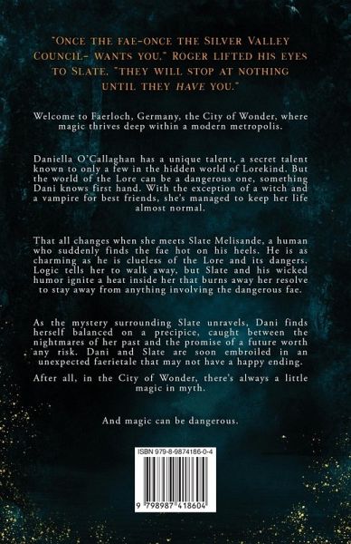 "Once the fae-once the Silver Valley Council-wants you," Roger lifted his eyes to Slate, "they will stop at nothing until they have you." Welcome to Faerloch, Germany, the City of Wonder, where magic thrives deep within a modern metropolis. Daniella O'Callaghan has a unique talent, a secret talent known to only a few in the hidden world of Lorekind. But the world of the Lore can be a dangerous one, something Dani knows first hand. With the exception of a witch and a vampire for best friends, she's managed to keep her life almost normal. That all changes when she meets Slate Melisande, a human who suddenly finds the fae hot on his heels. He is as charming as he is clueless of the Lore and its dangers. Logic tells her to walk away, but Slate and his wicked humor ignite a heat inside her that burns away her resolve to stay away from anything involving the dangerous fae. As the mystery surrounding Slate unravels, Dani finds herself balanced on a precipice, caught between the nightmares of her past and the promise of a future worth any risk. Dani and Slate are soon embroiled in an unexpected faerietale that may not have a happy ending. After all, in the City of Wonder, there's always a little magic in myth. And magic can be dangerous.
