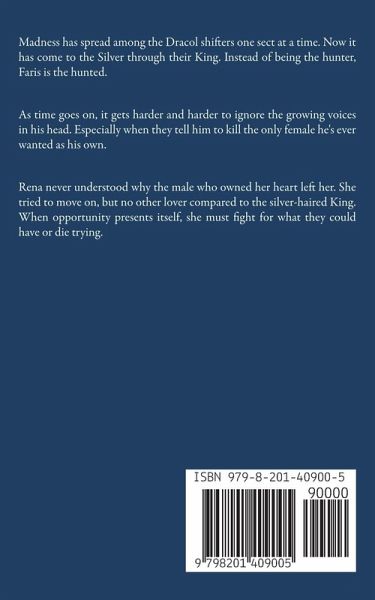 Madness has spread among the Dracol shifters one sect at a time. Now it has come to the Silver through their King. Instead of being the hunter, Faris is the hunted. As time goes on, it gets harder and harder to ignore the growing voices in his head. Especially when they tell him to kill the only female he's ever wanted as his own. Rena never understood why the male who owned her heart left her. She tried to move on, but no other lover compared to the silver-haired King. When opportunity presents itself, she must fight for what they could have or die trying.