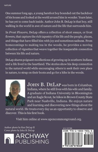 One summer long ago, a young barefoot boy bounded out the backdoor of his house and looked at the world around him in wonder. Years later, he has yet to come back inside. Author John B. DeLap is that boy, still walking in the world in awe of nature and the life that surrounds him. In Frost Flowers, DeLap offers a collection of short essays, or frost flowers, that capture the rich tapestry of his life and the people, places, and things that have filled him with joy and sometimes sadness. From homecomings to making tea in the woods, he provides a moving collection of vignettes that weave together the inseparable connection between his life and nature. DeLap shares poignant recollections of growing up in southern Indiana and a life lived in the heartland. The stories show his deep connection to the natural world while encouraging others to seek their own place in nature, to strap on their boots and go for a hike in the woods.