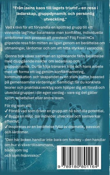 Denna bok väver samman en spännande fiktiv berättelse med djupgående insikter om ledarskap och gruppdynamik. Från isens kaos till lagets triumf - en resa i ledarskap, gruppdynamik och personlig utveckling. Vad krävs för att förvandla en splittrad grupp till ett vinnande lag? Hur balanserar man konflikter, individuella ambitioner och pressen att prestera? Följ Frost HCs gripande resa från mitten av liga genom en berättelse om utmaningar, lärdomar och om att hitta styrkan i varandra. Du får följa tränaren Ville och hans arbete med att forma ett lag genom konflikthantering, kommunikation och skapandet av en stark kultur baserad på gemensamma värderingar. Samtidigt får du konkreta teorier och praktiska verktyg som hjälper dig att förstå och utveckla grupper i din egen vardag - vare sig det gäller sport, arbetslivet eller andra team. Den här boken handlar inte bara on hockey, den handlar om hur vi växer tillsammans, både som lag och som människor.