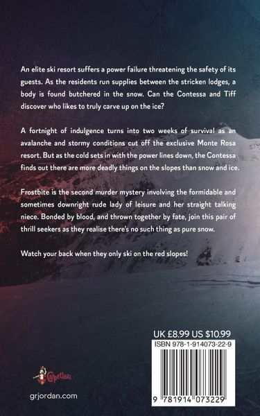 An elite ski resort suffers a power failure threatening the safety of its guests. As the residents run supplies between the stricken lodges, a body is found butchered in the snow. Can the Contessa and Tiff discover who likes to truly carve up on the ice? A fortnight of indulgence turns into two weeks of survival as an avalanche and stormy conditions cut off the exclusive Monte Rosa resort. But as the cold sets in with the power lines down, the Contessa finds out there are more deadly things on the slopes than snow and ice. Frostbite is the second murder mystery involving the formidable and sometimes downright rude lady of leisure and her straight talking niece. Bonded by blood, and thrown together by fate, join this pair of thrill seekers as they realise there's no such thing as pure snow. Watch your back when they only ski on the red slopes!