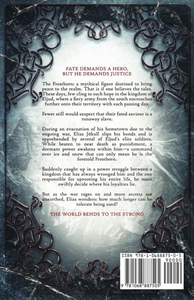 The first book of a captivating new series set in a Nordic-inspired world, where ancient magic awakens, and an unsuspecting hero must rise to face a chilling destiny. The Frostborn: a mythical figure destined to bring peace to the realm. That is if one believes the tales. These days, few cling to such hope in the kingdom of Eljud, where a fiery army from the south encroaches further onto their territory with each passing day. Fewer still would suspect that their fated saviour is a runaway slave. During an evacuation of his hometown due to the ongoing war, Elias Jökull slips his bonds and is apprehended by several of Eljud's elite soldiers. While beaten to near death as punishment, a dormant power awakens in himself-a command over ice and snow that can only mean he is the foretold Frostborn. Suddenly caught up in a power struggle between a kingdom that has always wronged him and the one responsible for uprooting his entire life, he must swiftly decide where his loyalties lie. But as the war rages on and more secrets are unearthed, Elias wonders: how much longer can he tolerate being used?
