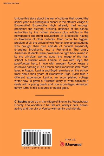 Unique this story about the war of cultures that rocked the senior year in a prestigious school in the affluent village of Brooksville! Brooksville High already had enough problems: the bullying, drinking, defiance of the school authorities by the richest students plus articles in the newspapers reporting accusations of Brooksville having no tolerance of other cultures. Then came the biggest problem of all: the arrival of two French exchange students who brought their own attitude of cultural superiority changing Brooksville into a Frenchville. The angry American students were powerless to fight back reined in by the principal, worried about the image of the host school. A student writer, Lanina, in love with Boyd, the poet/football hero, in love with arrogant Royce, keeps a chronicle naming it The French and Brooksville War. Years later, in August, Lanina and Boyd reminisce on the school track about their years at Brooksville High. Each tells a different experience. Lanina, an accomplished college writer now, is given a "Frosted" story to write because it deals with a young death and how a privileged American family turns it into a source of public good.
