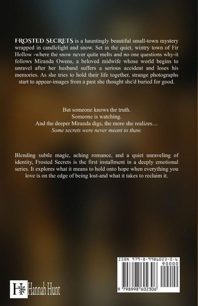 In the snow-covered town of Fir Hollow, where the magic of Christmas never fully melts away, Miranda Owens has created a quiet life rooted in community, healing, and tradition. As a trusted midwife and gentle presence in this small-town mystery, she's built something steady. Safe. But when her husband, Nick, suffers a traumatic accident that leaves his memory fractured, Miranda begins to feel her world shifting beneath her feet. Strange photographs begin appearing. Images from a time Miranda thought she'd left behind. Her cozy routines start to feel like a whisper of something darker. And the deeper she digs into the past, the more she realizes... some secrets were never meant to thaw. Blending emotional suspense, magical realism, and a touch of holiday mystery, Frosted Secrets is a slow-burn love story wrapped in wintry charm and hidden identity. It's the first book in a seasonal fiction series that explores what it means to hold onto hope, even when everything around you is beginning to fall apart. Perfect for readers who enjoy women's fiction with magic, whisper-soft romance, found family, and small-town secrets tucked between snowflakes. For fans of The Winter Sea, Addie LaRue, and The Christmas Murder Game, this is a book to curl up with beside twinkling lights and falling snow.