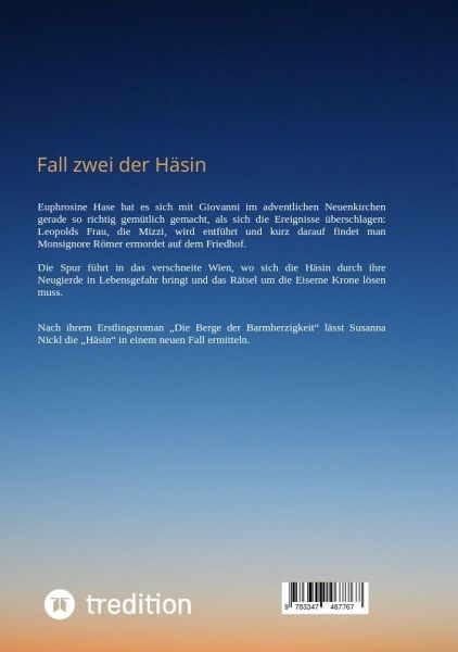 Euphrosine Hase hat es sich mit Giovanni im adventlichen Neuenkirchen gerade so richtig gemütlich gemacht, als sich die Ereignisse überschlagen: Leopolds Frau, die Mizzi, wird entführt und kurz darauf findet man Monsignore Römer ermordet auf dem Friedhof.Die Spur führt in das verschneite Wien, wo sich die Häsin durch ihre Neugierde in Lebensgefahr bringt und das Rätsel um die Eiserne Krone lösen muss.Nach ihrem Erstlingsroman "Die Berge der Barmherzigkeit" lässt Susanna Nickl die "Häsin" in einem neuen Fall ermitteln.