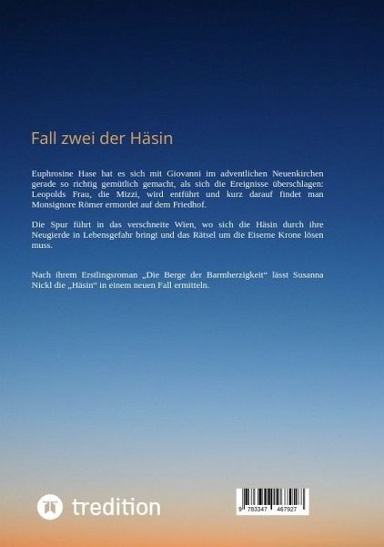 Euphrosine Hase hat es sich mit Giovanni im adventlichen Neuenkirchen gerade so richtig gemütlich gemacht, als sich die Ereignisse überschlagen: Leopolds Frau, die Mizzi, wird entführt und kurz darauf findet man Monsignore Römer ermordet auf dem Friedhof.Die Spur führt in das verschneite Wien, wo sich die Häsin durch ihre Neugierde in Lebensgefahr bringt und das Rätsel um die Eiserne Krone lösen muss.Nach ihrem Erstlingsroman "Die Berge der Barmherzigkeit" lässt Susanna Nickl die "Häsin" in einem neuen Fall ermitteln.