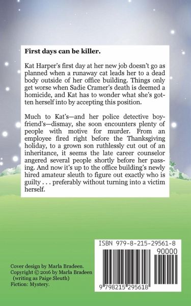 First days can be killer. Kat Harper's first day at her new job doesn't go as planned when a runaway cat leads her to a dead body outside of her office building. Things only get worse when Sadie Cramer's death is deemed a homicide, and Kat has to wonder what she's gotten herself into by accepting this position. Much to Kat's-and her police detective boyfriend's-dismay, she soon encounters plenty of people with motive for murder. From an employee fired right before the Thanksgiving holiday, to a grown son ruthlessly cut out of an inheritance, it seems the late career counselor angered several people shortly before her passing. And now it's up to the office building's newly hired amateur sleuth to figure out exactly who is guilty . . . preferably without turning into a victim herself. All of the Cozy Cat Caper Mystery books can be enjoyed as standalones but will be better appreciated as part of the series. The books are light, fun cozy mysteries featuring an animal-loving female amateur sleuth, lovable and not-so-lovable quirky characters, and a page-turning mystery that needs solving. None of the books include cliffhangers, bad language, or graphic scenes.