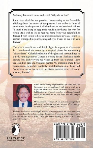 Suddenly Ira turned to me and asked "Why do we live?" I am taken aback by her question. I start staring at her face while thinking about the answer of her question. I am unable to think of any answer. In the process I take her hand in my hand and tell her "I think I am living to keep these hands in my hands for ever, for whole life. I wish to live to hear my name from your beautiful lips forever. I wish to live to hear your sweet melodious voice. I want to remain entrapped in your big magical eyes. I want to live with you forever." The ghat is now lit up with bright light. It appears as if someone has transformed the scene by a magical charm by murmuring "abracadabra". Colorful reflection of the ghat and surroundings in quietly running water of Ganges is looking divine. The hustle bustle around feels as if everyone has woken up from their slumber. There are sounds of bells and hymns of mantra. We are lost in these divine surroundings for awhile. Suddenly I took Ira's hand in my hand told "you know Ira, we live to keep this divine moment preserved in our memory forever."