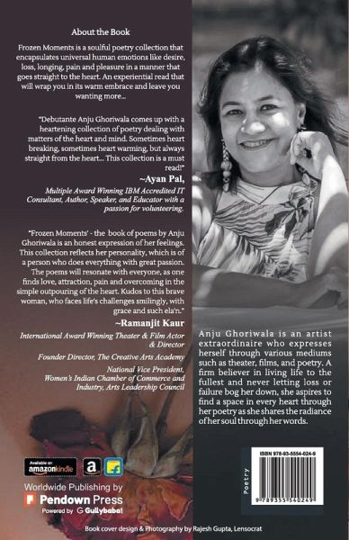 Frozen Moments is a soulful poetry collection that encapsulates universal human emotions like desire, loss, longing, pain and pleasure in a manner that goes straight to the heart. An experiential read that will wrap you in its warm embrace and leave you wanting more... Anju Ghoriwala is an artist extraordinaire who expresses herself through various mediums such as theater, films, and poetry. A firm believer in living life to the fullest and never letting loss or failure bog her down, she aspires to find a space in every heart through her poetry as she shares the radiance of her soul through her words.