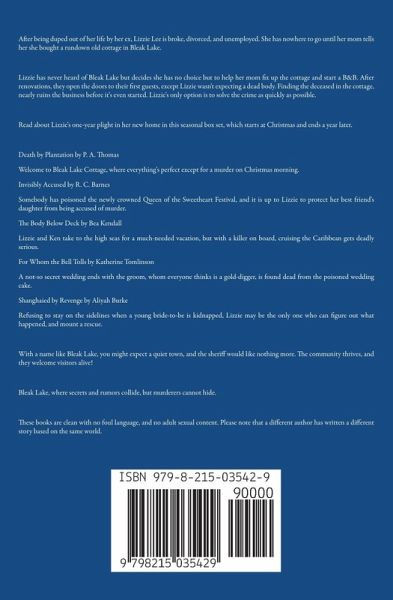 After being duped out of her life by her ex, Lizzie Lee is broke, divorced, and unemployed. She has nowhere to go until her mom tells her she bought a rundown old cottage in Bleak Lake. Lizzie has never heard of Bleak Lake but decides she has no choice but to help her mom fix up the cottage and start a B&B. After renovations, they open the doors to their first guests, except Lizzie wasn't expecting a dead body. Finding the deceased in the cottage, nearly ruins the business before it's even started. Lizzie's only option is to solve the crime as quickly as possible. Read about Lizzie's one-year plight in her new home in this seasonal box set, which starts at Christmas and ends a year later. Death by Plantation by P. A. Thomas Welcome to Bleak Lake Cottage, where everything's perfect except for a murder on Christmas morning. Invisibly Accused by R. C. Barnes Somebody has poisoned the newly crowned Queen of the Sweetheart Festival, and it is up to Lizzie to protect her best friend's daughter from being accused of murder. The Body Below Deck by Bea Kendall Lizzie and Ken take to the high seas for a much-needed vacation, but with a killer on board, cruising the Caribbean gets deadly serious. For Whom the Bell Tolls by Katherine Tomlinson A not-so secret wedding ends with the groom, whom everyone thinks is a gold-digger, is found dead from the poisoned wedding cake. Shanghaied by Revenge by Aliyah Burke Refusing to stay on the sidelines when a young bride-to-be is kidnapped, Lizzie may be the only one who can figure out what happened, and mount a rescue. With a name like Bleak Lake, you might expect a quiet town, and the sheriff would like nothing more. The community thrives, and they welcome visitors alive! Bleak Lake, where secrets and rumors collide, but murderers cannot hide. These books are clean with no foul language, and no adult sexual content. Please note that a different author has written a different story based on the same world.