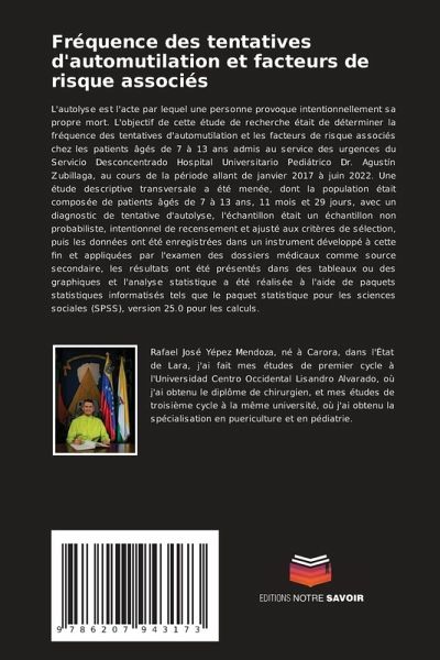 L'autolyse est l'acte par lequel une personne provoque intentionnellement sa propre mort. L'objectif de cette étude de recherche était de déterminer la fréquence des tentatives d'automutilation et les facteurs de risque associés chez les patients âgés de 7 à 13 ans admis au service des urgences du Servicio Desconcentrado Hospital Universitario Pediátrico Dr. Agustín Zubillaga, au cours de la période allant de janvier 2017 à juin 2022. Une étude descriptive transversale a été menée, dont la population était composée de patients âgés de 7 à 13 ans, 11 mois et 29 jours, avec un diagnostic de tentative d'autolyse, l'échantillon était un échantillon non probabiliste, intentionnel de recensement et ajusté aux critères de sélection, puis les données ont été enregistrées dans un instrument développé à cette fin et appliquées par l'examen des dossiers médicaux comme source secondaire, les résultats ont été présentés dans des tableaux ou des graphiques et l'analyse statistique a été réalisée à l'aide de paquets statistiques informatisés tels que le paquet statistique pour les sciences sociales (SPSS), version 25.0 pour les calculs.