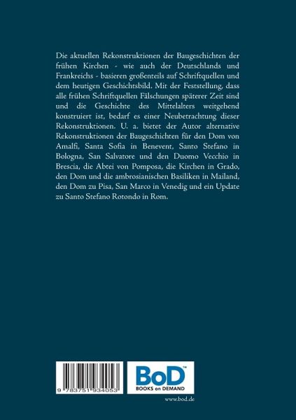 Die aktuellen Rekonstruktionen der Baugeschichten der frühen Kirchen - wie auch der Deutschlands und Frankreichs - basieren großenteils auf Schriftquellen und dem heutigen Geschichtsbild. Mit der Feststellung, dass alle frühen Schriftquellen Fälschungen späterer Zeit sind und die Geschichte des Mittelalters weitgehend konstruiert ist, bedarf es einer Neubetrachtung dieser Rekonstruktionen. U. a. bietet der Autor alternative Rekonstruktionen der Baugeschichten für den Dom von Amalfi, Santa Sofia in Benevent, Santo Stefano in Bologna, San Salvatore und den Duomo Vecchio in Brescia, die Abtei von Pomposa, die Kirchen in Grado, den Dom und die ambrosianischen Basiliken in Mailand, den Dom zu Pisa, San Marco in Venedig und ein Update zu Santo Stefano Rotondo in Rom.