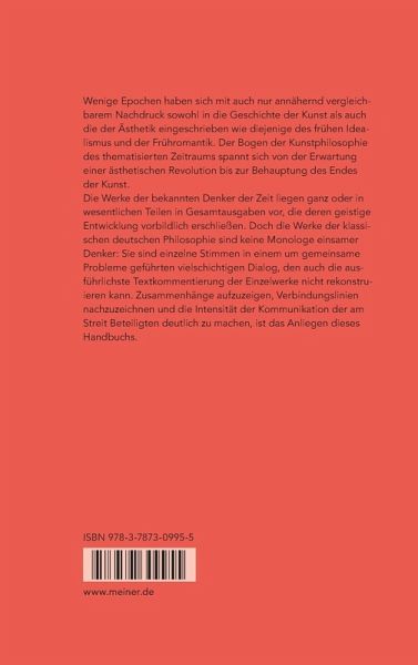 Wenige Epochen haben sich mit auch nur annähernd vergleichbarem Nachdruck sowohl in die Geschichte der Kunst als auch die der Ästhetik eingeschrieben wie diejenige des frühen Idealismus und der Frühromantik. Der Bogen der Kunstphilosophie des thematisierten Zeitraums spannt sich von der Erwartung einer ästhetischen Revolution bis zur Behauptung des Endes der Kunst. Die Werke der bekannten Denker der Zeit liegen ganz oder in wesentlichen Teilen in Gesamtausgaben vor, die deren geistige Entwicklung vorbildlich erschließen. Doch die Werke der klassischen deutschen Philosophie sind keine Monologe einsamer Denker: Sie sind einzelne Stimmen in einem um gemeinsame Probleme geführten vielschichtigen Dialog, den auch die ausführlichste Textkommentierung der Einzelwerke nicht rekonstruieren kann. Zusammenhänge aufzuzeigen, Verbindungslinien nachzuzeichnen und die Intensität der Kommunikation der am Streit Beteiligten deutlich zu machen, ist das Anliegen dieses Handbuchs.