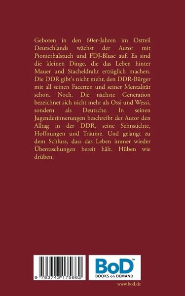 Geboren in den 60er-Jahren im Ostteil Deutschlands wächst der Autor mit Pionierhalstuch und FDJ-Bluse auf. Es sind die kleinen Dinge, die das Leben hinter Mauer und Stacheldraht erträglich machen. Die DDR gibt's nicht mehr, den DDR-Bürger mit all seinen Facetten und seiner Mentalität schon. Noch. Die nächste Generation bezeichnet sich nicht mehr als Ossi und Wessi, sondern als Deutsche. In seinen Jugenderinnerungen beschreibt der Autor den Alltag in der DDR, seine Sehnsüchte, Hoffnungen und Träume. Und gelangt zu dem Schluss, dass das Leben immer wieder Überraschungen bereit hält. Hüben wie drüben.