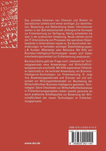 Bernhard Gehra geht der Frage nach, in wie weit der Technologieeinsatz neue Anwendungs- und Wirtschaftlichkeitspotenziale erschließt. Mit Hilfe explorativer Fallstudien beschreibt er die konkrete Anwendung von Business-Intelligence-Technologien zur Früherkennung. Er zeigt ihre Anwendungspotenziale und Grenzen auf und entwickelt ein Wirkungskettenmodell zur Beurteilung der Wirtschaftlichkeit Business-Intelligence-gestützter Technologien. Seine Checklisten zur Wirtschaftlichkeitsanalyse in Früherkennungsprojekten bieten sowohl generelle als auch praktische Anhaltspunkte zur Bewertung der Wirtschaftlichkeit der neuen Technologien im Früherkennungsprozess.