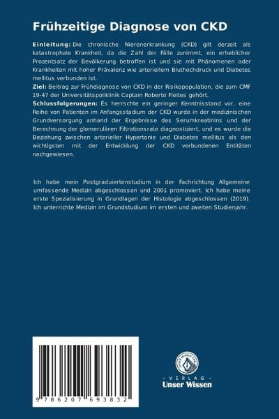 Einleitung: Die chronische Nierenerkrankung (CKD) gilt derzeit als katastrophale Krankheit, da die Zahl der Fälle zunimmt, ein erheblicher Prozentsatz der Bevölkerung betroffen ist und sie mit Phänomenen oder Krankheiten mit hoher Prävalenz wie arteriellem Bluthochdruck und Diabetes mellitus verbunden ist.Ziel: Beitrag zur Frühdiagnose von CKD in der Risikopopulation, die zum CMF 19-47 der Universitätspoliklinik Captain Roberto Fleites gehört.Schlussfolgerungen: Es herrschte ein geringer Kenntnisstand vor, eine Reihe von Patienten im Anfangsstadium der CKD wurde in der medizinischen Grundversorgung anhand der Ergebnisse des Serumkreatinins und der Berechnung der glomerulären Filtrationsrate diagnostiziert, und es wurde die Beziehung zwischen arterieller Hypertonie und Diabetes mellitus als den wichtigsten mit der Entwicklung der CKD verbundenen Entitäten nachgewiesen.