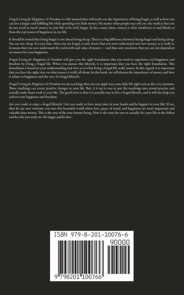 Frugal Living for Happiness & Freedom is a life manual that will teach you the importance of being frugal, as well as how you can live a happy and fulfilling life while spending very little money. No matter what people may tell you, the truth is that you do not need so much money in your life to be truly happy. In fact, many times, money is what misdirects us and blinds us from the real source of happiness in our life. It should be noted that being frugal is not about being cheap. There is a big difference between being frugal and being cheap. You are not cheap. It is just that, when you are frugal, it only shows that you now understand and view money as it really is. It means that you now understand the real worth and value of money - and that now you know that you are not dependent on money for your happiness. Frugal Living for Happiness & Freedom will give you the right foundation that you need to experience real happiness and freedom by living a frugal life. When you pursue this lifestyle, it is important that you have the right foundation. This foundation is based on your understanding and view as to what living a frugal life really means. In this regard, it is important that you have the right view on what money is really all about. In this book, we will discuss the importance of money and how it relates to happiness and the way of a frugal lifestyle. Frugal Living for Happiness & Freedom reveals teachings that you can apply into your daily life right now at this very moment. These teachings can create positive changes in your life. But, it is up to you to put the teachings into actual practice and actually make them work in your life. The good news is that it is actually easy to live a frugal lifestyle, and it will also help you achieve true happiness and freedom. Are you ready to enjoy a frugal lifestyle? Are you ready to have more time in your hands and be happier in your life? If yes, then let me now welcome you into this beautiful world where love, peace of mind, and happiness are more important and valuable than money. This is the way of the true human being. Now is the time for you to actually live your life to the fullest and be who you truly are. Be happy and be free.