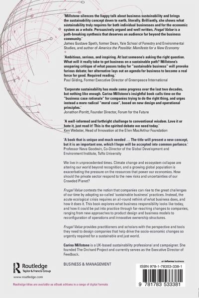 'Frugal Value reminds us that sustainability - despite its widespread abuse as a concept over the past 30 years - remains non-negotiable. The Planet cannot be 'traded off' for profit any more than oxygen can traded off for food. Frugal Value is a wake-up call to business leaders and sustainability practitioners alike: neither the 'business case for sustainability' nor current 'sustainable consumption and production' practices will get us anywhere near to the biodiverse and ecologically secure future we need to survive and thrive. Millstone calls attention to the elephant in the room - the current failure of so-called sustainable practices - and with skillful analysis, sketches out a more ambitious, transformational path: the imperative of redesigning our economic system and business models to achieve frugal value.'