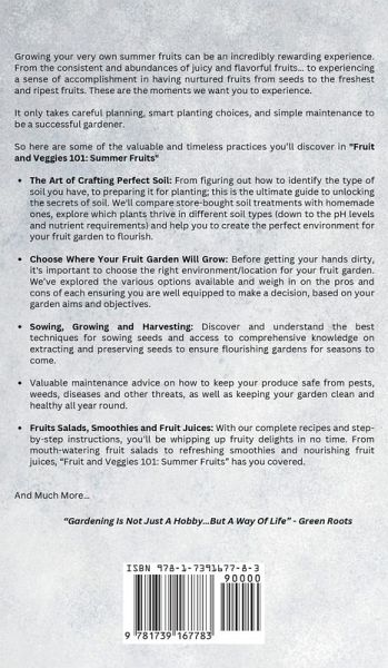 Get ready to harvest the most succulent, flavorful, and perfect fruits with Fruit and Veggies 101: Summer Fruits. Are you hesitant to embark on your fruit-growing journey due to lack of experience, resources, or budget? Don't worry - we've got you covered. Keep reading to uncover the secrets to abundant summer fruit cultivation. Growing your very own summer fruits can be an incredibly rewarding experience. From the consistent and abundances of juicy and flavorful fruits... to experiencing a sense of accomplishment in having nurtured plants from a seeds to a fully ripened fruits. These are the moments we want you to experience. Discover the secrets to fruitful gardening with our comprehensive guide. We've distilled the essentials into an easy-to-follow format that works whether you're a beginner or an experienced gardener. With this resource at your fingertips, you'll be well-equipped to cultivate a bountiful harvest of your own. It only takes careful planning, smart planting choices, and simple maintenance to be a successful gardener. Why this guide differs from the rest is the spectrum of information it has to offers. From practical tips to in-depth analysis - it offers additional guidance on how to maximize your fruit harvest, season after season. We're referring to the inclusive recipes and guidance on how to concoct your very own fruits salads, smoothies and fruit juices using the fruits harvested from your garden. When we said that this guide provides a "spectrum of information" we really meant it. So here are some of the valuable and timeless practises you'll discover in "Fruit and Veggies 101: Summer Fruits". The Art of Crafting Perfect Soil: From figuring out how to identify the type of soil you have, to preparing it for planting; this is the ultimate guide to unlocking the secrets of soil. We'll compare store-bought soil treatments with homemade ones, explore which plants thrive in different soil types (down to the pH levels and nutrient requirements) and help you to create the perfect environment for your fruit garden to flourish. Choose Where Your Fruit Garden Will Grow: Before getting your hands dirty, it's important to choose the right environment/location for your fruit garden. We've explored the various options available and weigh in on the pros and cons of each ensuring you are well equipped to make a decision, based on your garden aims and objectives. Sowing, Growing and Harvesting: Discover an understand the best techniques for sowing seeds and access to comprehensive knowledge on extracting and preserving seeds to ensure flourishing gardens for seasons to come. Valuable maintenance advice on how to keep your produce safe from pests, weeds, diseases and other threats, as well as keeping your garden clean and healthy all year round. Fruits salads, Smoothies and Fruit Juices: With our complete recipes and step-by-step instructions, you'll be whipping up fruity delights in no time. From mouth-watering fruit salads to refreshing smoothies and nourishing fruit juices, "Fruit and Veggies 101: Summer Fruits" has you covered. And much more...