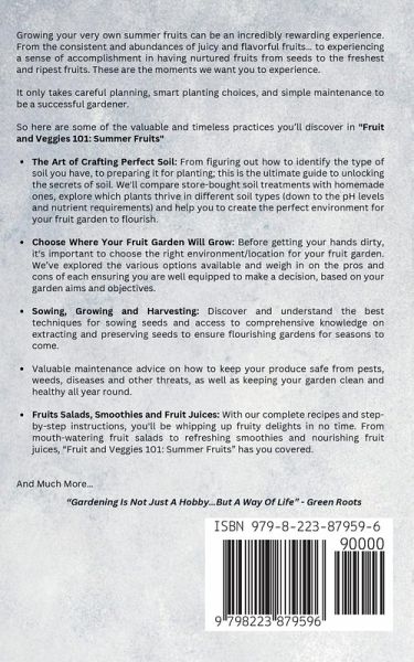 Get ready to harvest the most succulent, flavorful, and perfect fruits with Fruit and Veggies 101: Summer Fruits. Are you hesitant to embark on your fruit-growing journey due to lack of experience, resources, or budget? Don't worry - we've got you covered. Keep reading to uncover the secrets to abundant summer fruit cultivation. Growing your very own summer fruits can be an incredibly rewarding experience. From the consistent and abundances of juicy and flavorful fruits you can lay your hands on... to experiencing a sense of accomplishment in having nurtured something from seeds to fully ripened fruit. These are the moments we want you to experience. Discover the secrets to fruitful gardening with our comprehensive guide. We've distilled the essentials into an easy-to-follow format that works whether you're a beginner or an experienced gardener. With this resource at your fingertips, you'll be well-equipped to cultivate a bountiful harvest of your own. It only takes careful planning, smart planting choices, and simple maintenance to be a successful gardener. Why this guide differs from the rest is the spectrum of information it has to offers. From practical tips to in-depth analysis - it offers additional guidance on how to maximize your fruit harvest, season after season. We're referring to the inclusive recipes and guidance on how to concoct your very own fruits salads, smoothies and fruit juices using the fruits harvested from your garden. When we said that this guide provides a "spectrum of information" we really meant it. So here are some of the valuable and timeless practises you'll discover in "Fruit and Veggies 101: Summer Fruits".The Art of Crafting Perfect Soil: From figuring out how to identify the type of soil you have, to preparing it for planting; this is the ultimate guide to unlocking the secrets of soil. We'll compare store-bought soil treatments with homemade ones, explore which plants thrive in different soil types (down to the pH levels and nutrient requirements) and help you to create the perfect environment for your fruit garden to flourish. Choose Where Your Fruit Garden Will Grow: Before getting your hands dirty, it's important to choose the right environment/location for your fruit garden. We've explored the various options available and weigh in on the pros and cons of each ensuring you are well equipped to make a decision, based on your garden aims and objectives. Sowing, Growing and Harvesting: Discover an understand the best techniques for sowing seeds and access to comprehensive knowledge on extracting and preserving seeds to ensure flourishing gardens for seasons to come. Valuable maintenance advice on how to keep your produce safe from pests, weeds, diseases and other threats, as well as keeping your garden clean and healthy all year round. Fruits salads, Smoothies and Fruit Juices: With our complete recipes and step-by-step instructions, you'll be whipping up fruity delights in no time. From mouth-watering fruit salads to refreshing smoothies and nourishing fruit juices, "Fruit and Veggies 101: Summer Fruits" has you covered. And much more...